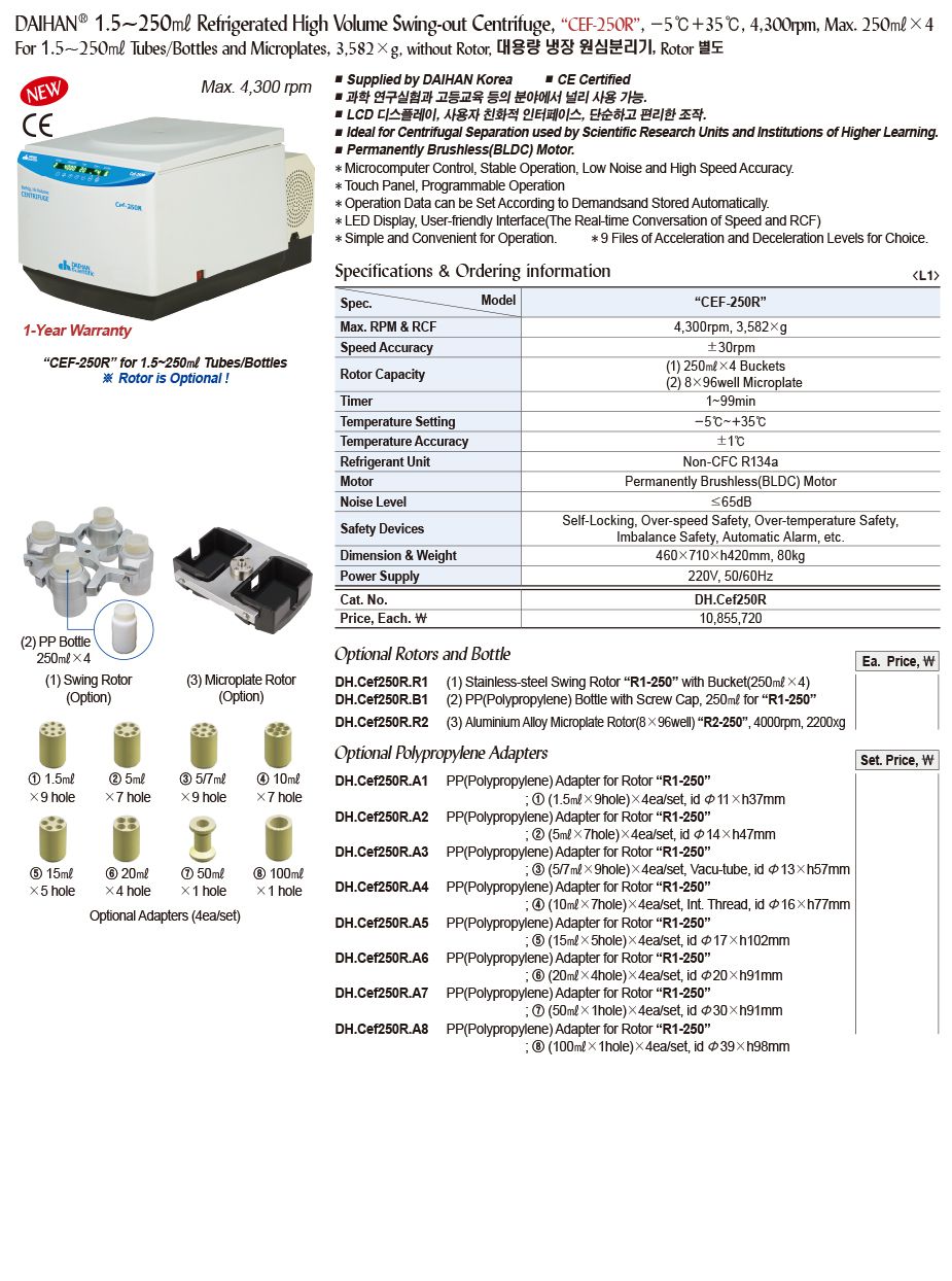 DaiHan CEF-250R 1.5~250㎖ Refrigerated High Volume Swing-out Centrifuge (4,300rpm, 3,582×g)