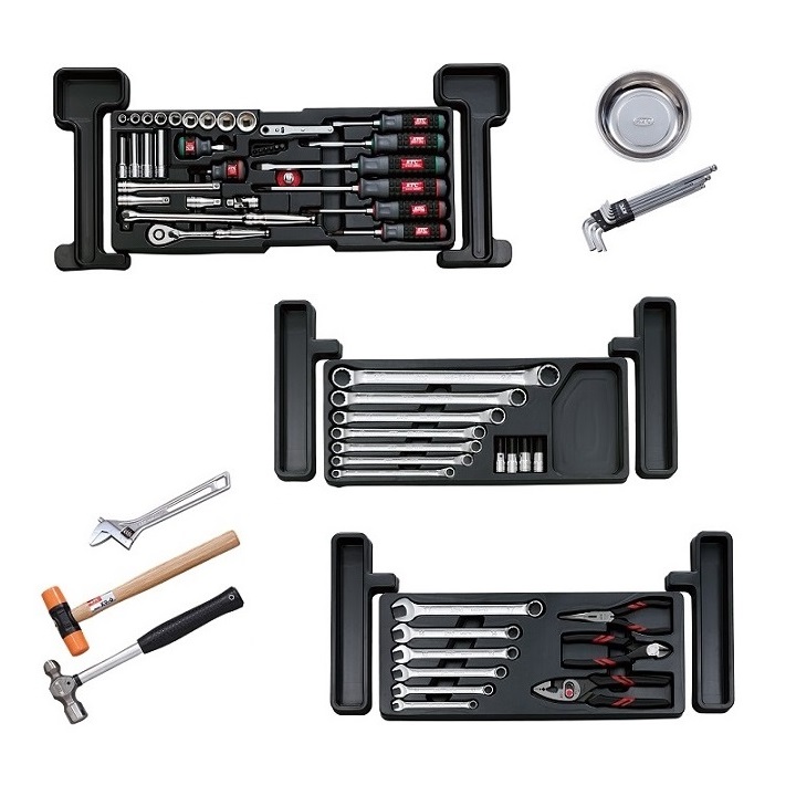 Có 1 số dụng cụ để bên ngoài khay nhựa: như búa sắt, búa nhựa, bộ lục giác, mỏ lết.