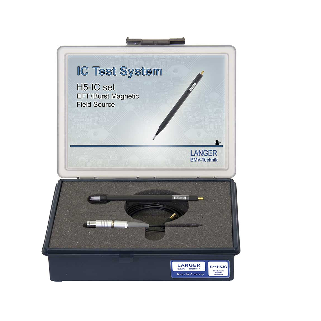 The BS 06DU-s magnetic field source is used to generate magnetic EFT/burst fields. An EFT/burst generator (IEC 61000-4-4) supplies the field source with an EFT/burst current via an RF cable. The field source generates high magnetic fields (approx. 150 mT) in very small spaces. It is thus ideal for coupling the field into ICs. The field source can be inserted into a scanner or can be guided by hand. It has a SMB output.