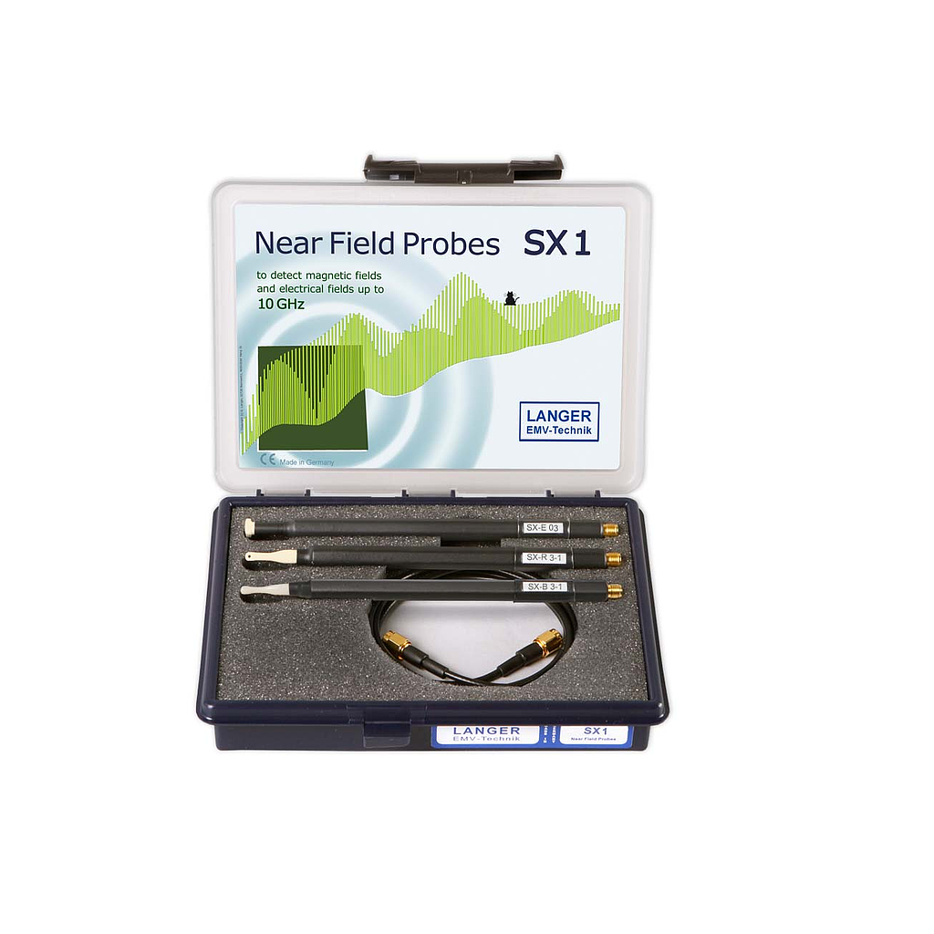 The SX1 set consists of three passive near-field probes for measuring E-fields and magnetic fields with a high clock frequency from 1 GHz to 10 GHz on electronic assemblies and ICs during the development stage. The different probe heads of the SX1 set allow for measurements very close to the electronic assemblies, e.g. on single IC pins, conducting paths, components, and connectors, in order to localize interference sources. An electronic assembly’s field orientation and field distribution can be detected through specific use of the near-field probe. The near-field probes are small and handy. They have a current attenuating sheath and are electrically shielded. They can be connected to a spectrum analyzer or an oscilloscope with a 50 Ω input.