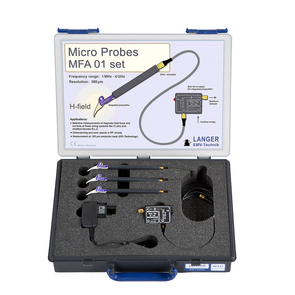 The MFA 01 set includes high-resolution near-field micro probes used to measure magnetic fields up to 6 GHz, e.g. at signal conductors (150 µm), SMD components (0603-0201), or IC pins. Each hand-guided MFA near-field micro probe has an integrated preamplifier.