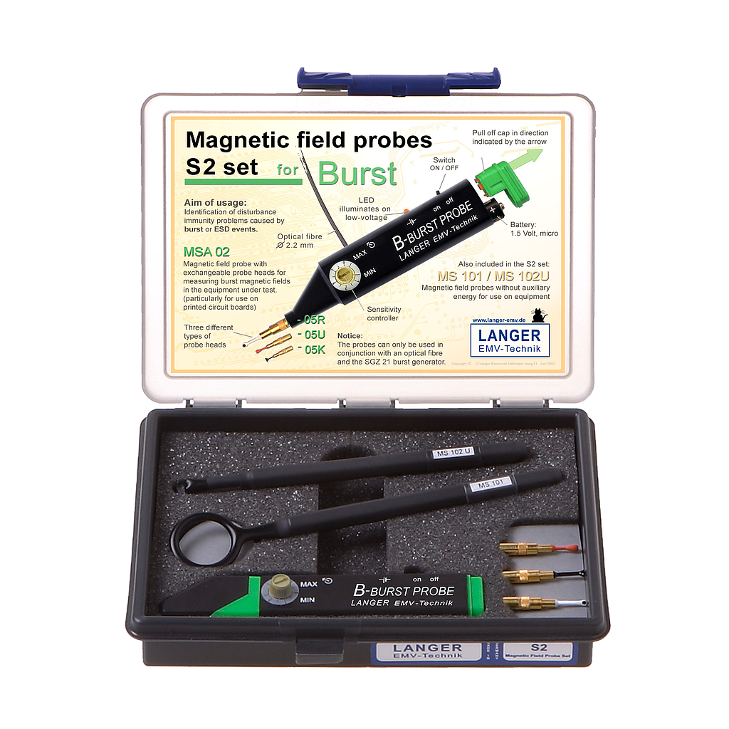The S2 set contains active and passive magnetic field probes. They measure the nonreactive fast transient pulse magnetic fields in electonic devices and assemblies under interference. Burst and ESD processes, which cause problems in the device under test, can be analyzed. The magnetic field probes transmit the measured signals via the LWL connection to the optical receiver of the SGZ 21. The S2 set can only be operated with the SGZ 21 burst generator included in the E1 set. One AAA battery is required to operate the MSA 02 probe.