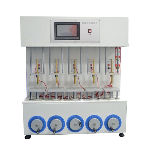 Button key life testing machine is suitable for key switch, computer keyboard, conductive rubber, metal shrapnel key (commonly known as pot) or the same type of life aging test, USES the advanced programmer life test process control buttons, can conduct life test and conducting tests at the same time, key damage automatic stop, always “conduction” or object to be tested is always “no conduction, the machine will stop running in 8 seconds