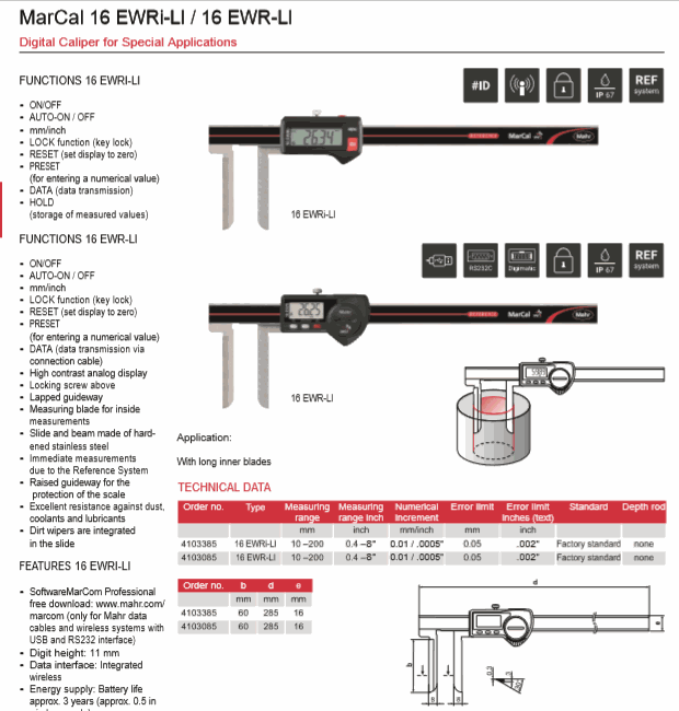 Mahr 4103085 Digital Caliper ສໍາລັບຄໍາຮ້ອງສະຫມັກພິເສດ (16 EWR-LI, 10-200mm) | EMIN.COM.LA