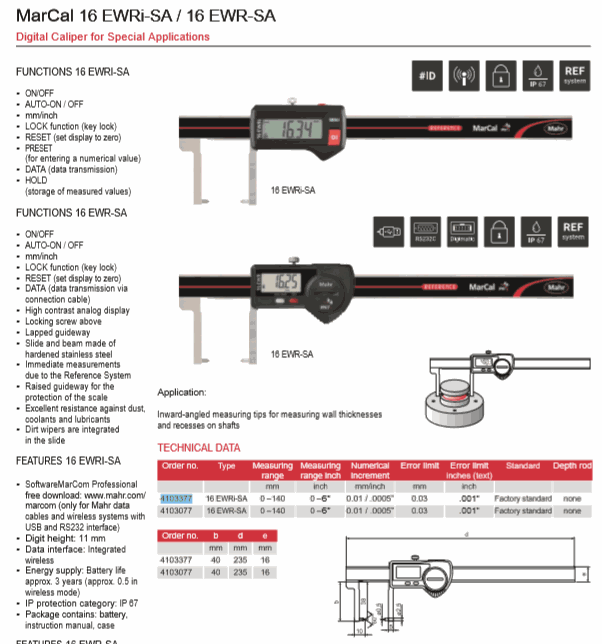Mahr 4103377 Digital Caliper ສໍາລັບຄໍາຮ້ອງສະຫມັກພິເສດ (16 EWRi-SA, 0-140mm) | EMIN.COM.LA