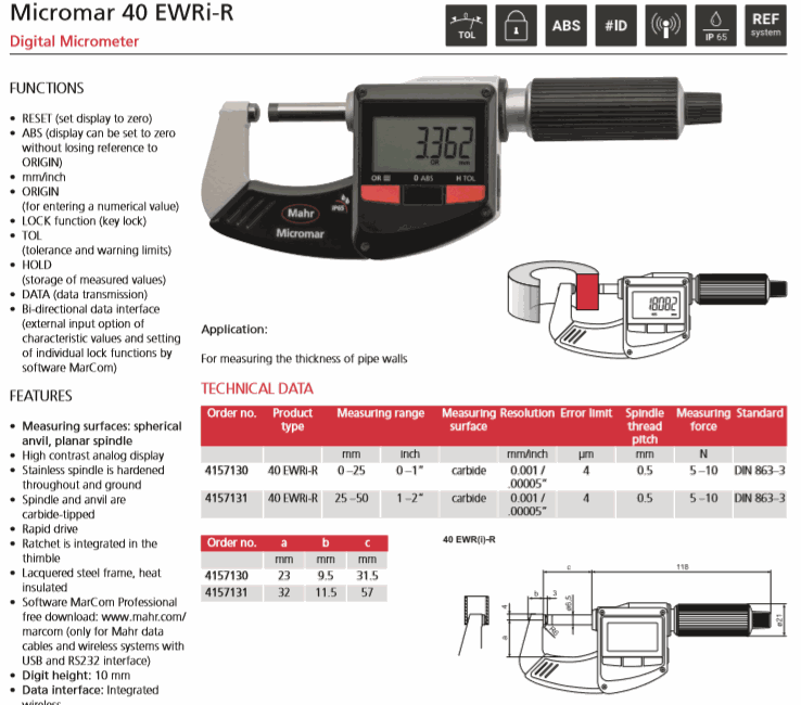 Mahr 4157130 ໄມໂຄມິເຕີດິຈິຕອນ (40 EWRi-R, 0-25mm/0-1") | EMIN.COM.LA