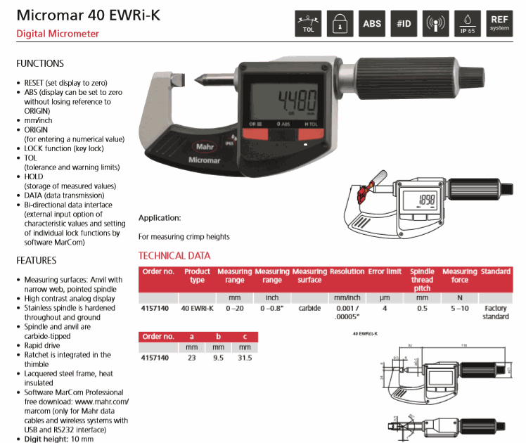 Mahr 4157140 ໄມໂຄມິເຕີດິຈິຕອນ (40 EWRi-K, 0-20mm/0-0.8") | EMIN.COM.LA