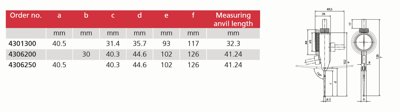 Package contains: case, instruction manual, spanner for changing the styli, stylus dia. ø 2 mm, mounting shaft 800a6 (800 SA/SGA/SGB), mounting shaft 800a8