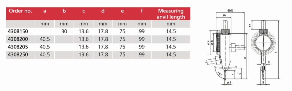 Package contains: case, instruction manual, spanner for changing the styli, stylus dia. ø 2 mm, mounting shaft 800a8