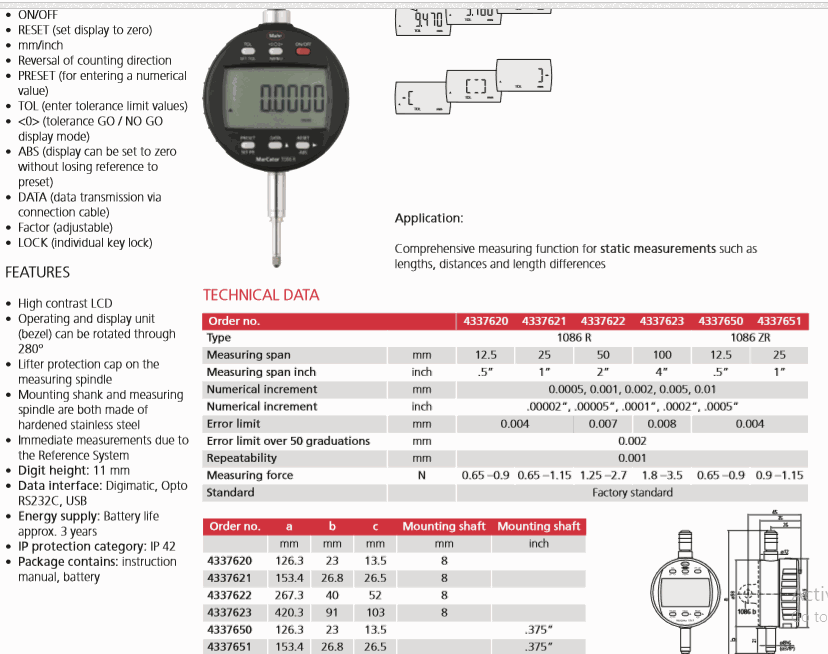 Numerical increment: 0.0005, 0.001, 0.002, 0.005, 0.01mm/.00002”, .00005”, .0001”, .0002”, .0005”