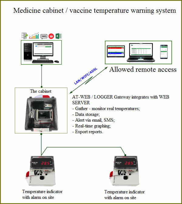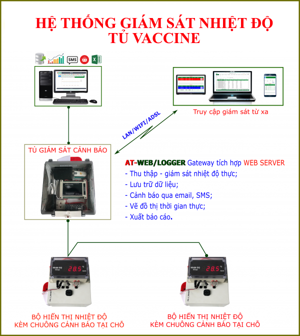 - Meet the criteria of the authorities on standard supervision requirements for cold storage, pharmaceutical warehouses, vaccine cabinets, server rooms ... in terms of temperature and humidity. hardware and software