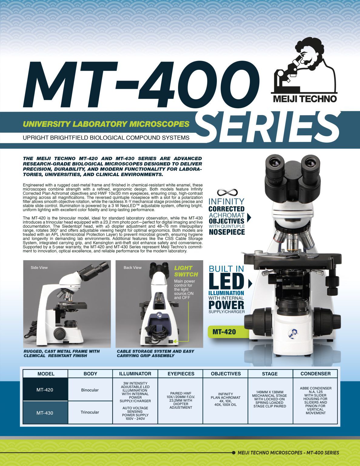 Plan infinity corrected objectives have a unique swiveling system of the eyepiece tubes for ergonomic positioning of both tubes in a high (431mm) and in a low position (377mm)