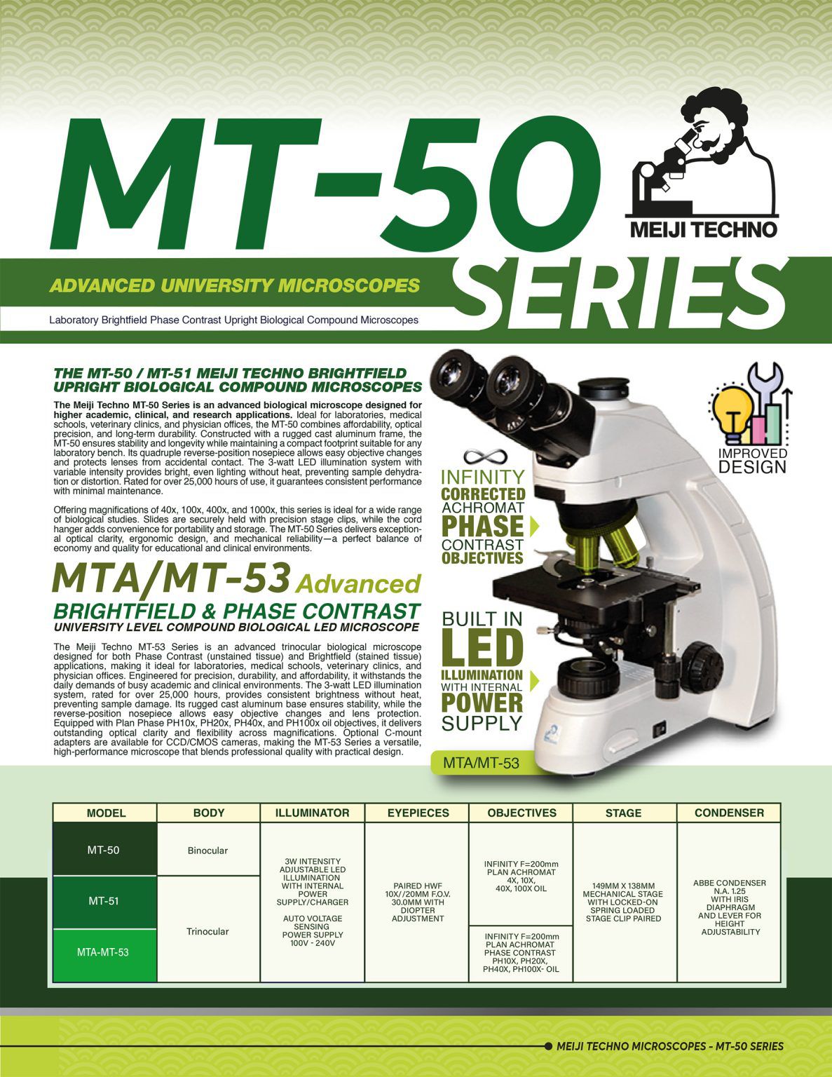 Siedentopf type design, binocular 30° inclined tube on MT-50 Series, interpupillary distance adjustment 48-75mm, 360 degree rotatable.