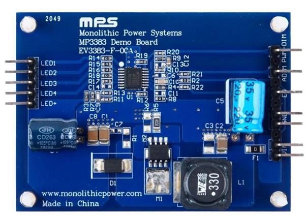 Monolithic Power Systems (MPS) EV3383-F-00A ບອດປະເມີນ 4-String, Max 400mA/String, Max 80V VOUT, ຕົວຄວບຄຸມ Step-Up WLED ໃນຊຸດ TSSOP-16EP ບອດປະເມີນ