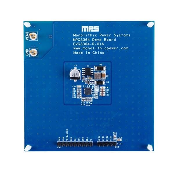 Monolithic Power Systems (MPS) EVQ3364-R-01A ບອດປະເມີນ 150mA, 4-ຊ່ອງ, ຄວບຄຸມຜູ້ຂັບ WLED ເພີ່ມພູມພິມດ້ວຍອັດຕາການຫຼຸດແສງ 15000:1 ແລະ ບອດປະເມີນ I2C, ຜ່ານການຮັບຮອງ AEC-Q100