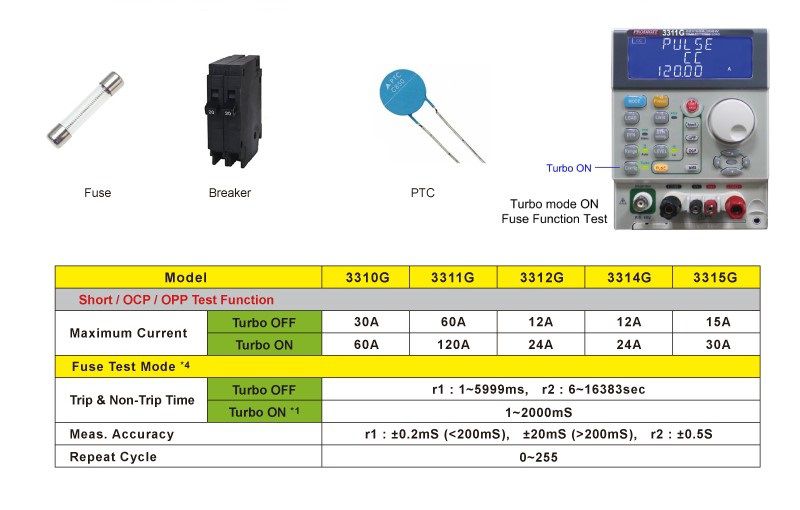 To test these protection devices, the 3310G Series of electronic loads are specifically designed for test verification of current protection components. A Fuse Test function that can be used with Turbo mode that provides 2 times the rated current and power for a short period of time. This allows testing and verification of these components with about 2 times the current and power specifications of the components.