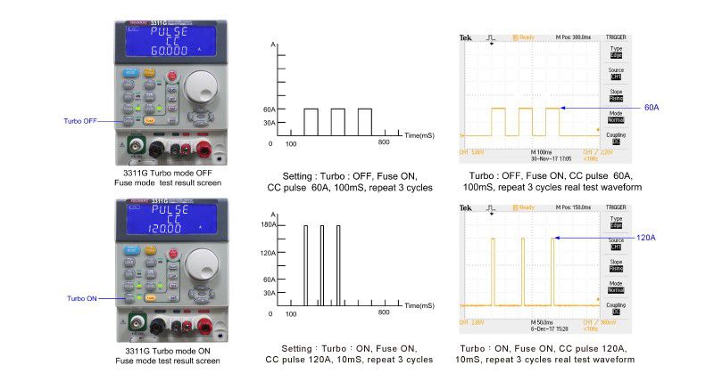 The power supply products under test must respond with the appropriate protection function but the abnormal situation duration is often quite short. To test for conditions, Prodigit's 3310G Series electronic load can increase the electronic load current and power in the new Turbo mode some period of time (within 2 seconds) up to 2 times the rated value. For example, the 3311G 60V /60A/ 300W in Turbo mode can increase its load current to 120A or power to 600W electronic load for up to two seconds. When verifying power products using Turbo mode in a production test environment, 3310G Series electronic loads offer greater test verification capability compared to conventional DC loads. Furthermore, the 3310G Series built-in measurement circuits can also measure the actual trip current value and protection response time under short-circuit or overload test conditions.