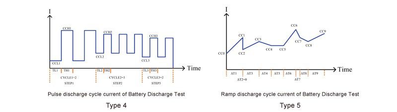 There are also CC pulse cycle life test and CC Ramp Cycle life test types (Type 4, Type5 provides remote operating only). These can be used to simulate the battery in actual use by using a variety of load current changes and cycle variations. The user can verify and simulate the performance and life during actual use of batteries.
