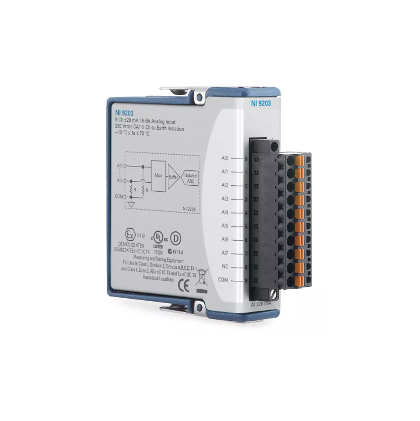 The C Series Current Input Module features programmable input ranges, variable connectivity options, and built-in noise rejection. You can also choose from options with built-in anti-aliasing filters or high-channel density to reduce the number of modules needed. The C Series Current Input Module supports safety features, certifications, input ranges, overvoltage ranges, and connectivity for applications such as power quality monitoring and metering, utility pole-mounted smart switches, utility pole-mounted smart grid reclosers, substation merging units, industrial machine measurements, health monitoring, predictive maintenance and prognostics, and phasor measurement units (PMUs). The C Series Current Input Module includes the NI-DAQmx driver and configuration utility that simplify configuration and measurements. NI-DAQmx supports NI programming environments as well as Python, ANSI C, C#.NET, and MathWorks MATLAB® software.