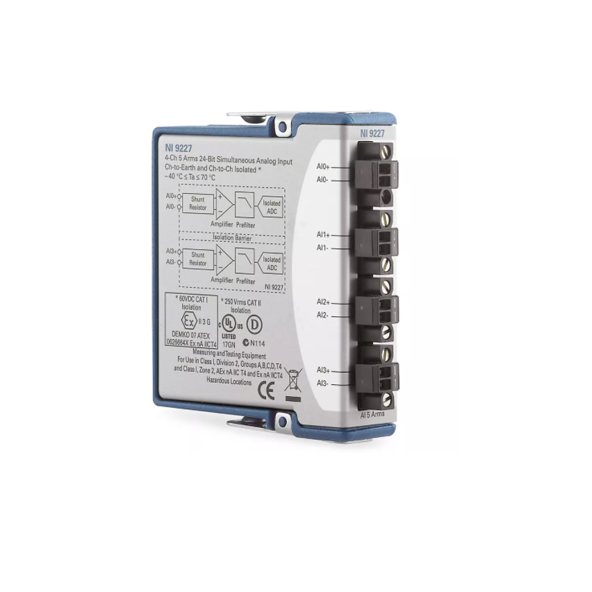 The C Series Current Input Module features programmable input ranges, variable connectivity options, and built-in noise rejection. You can also choose from options with built-in anti-aliasing filters or high-channel density to reduce the number of modules needed. The C Series Current Input Module supports safety features, certifications, input ranges, overvoltage ranges, and connectivity for applications such as power quality monitoring and metering, utility pole-mounted smart switches, utility pole-mounted smart grid reclosers, substation merging units, industrial machine measurements, health monitoring, predictive maintenance and prognostics, and phasor measurement units (PMUs). The C Series Current Input Module includes the NI-DAQmx driver and configuration utility that simplify configuration and measurements. NI-DAQmx supports NI programming environments as well as Python, ANSI C, C#.NET, and MathWorks MATLAB® software.