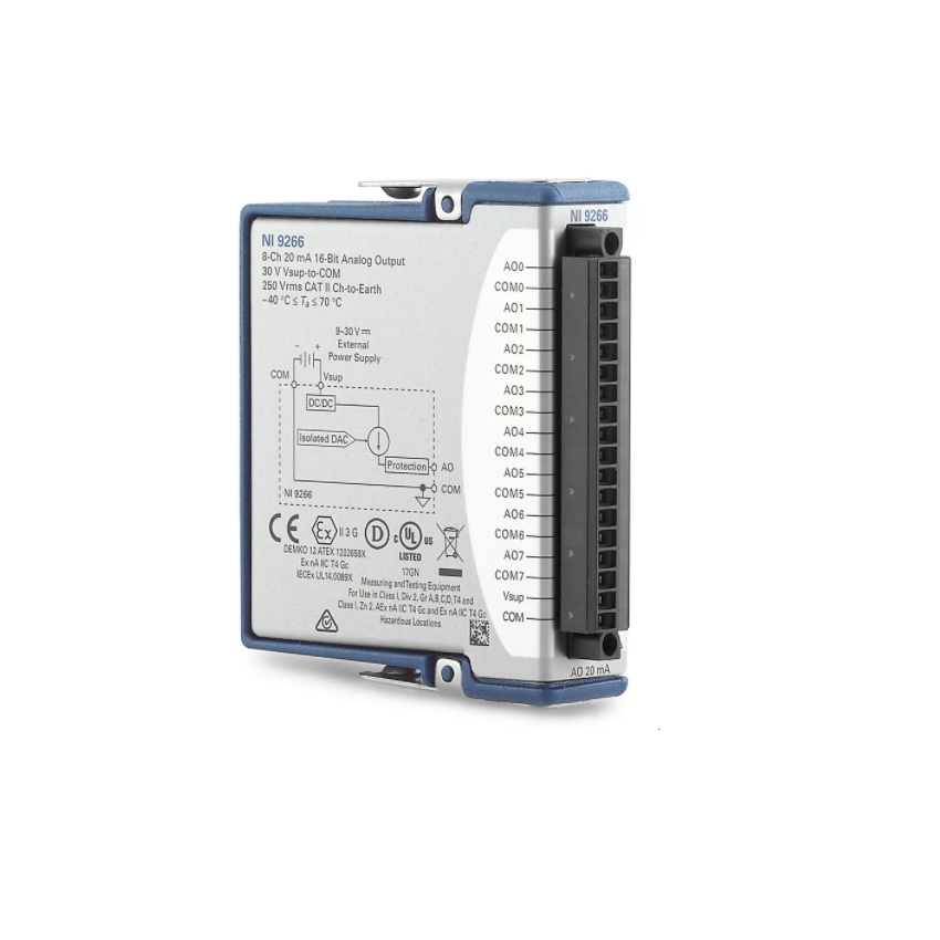 The C Series Current Output Module features up to eight channels of simultaneous analog output. You can choose between enclosed and non-enclosed modules. Additionally, the C Series Current Output Module has built-in open-loop detection. This detection generates an interrupt in software when an open loop is detected, zeros outputs to ensure safety, and avoids driving actuators at system power-on. The C Series Current Output Module requires an external power supply and includes a channel-to-earth ground double isolation barrier for safety and noise immunity.The C Series Current Output Module includes the NI-DAQmx driver and configuration utility that simplify configuration and measurements. NI-DAQmx supports NI programming environments as well as Python, ANSI C, C#.NET, and MathWorks MATLAB® software.