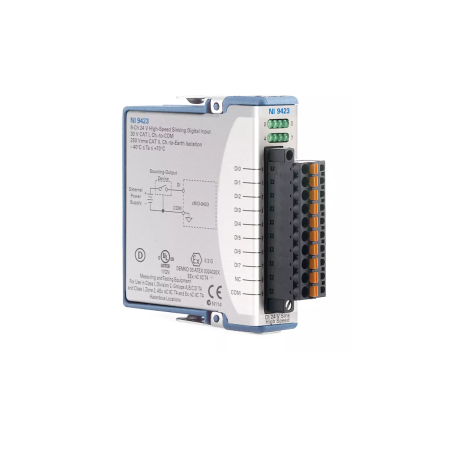 The C Series Digital Module interacts with a range of industrial switches, transducers, and devices. Some modules include an LED per channel that indicates the state of the channel. It supports input, output, or a combination of digital lines, and they can interact with a variety of voltages and logic levels, so they are well-suited for a variety of benchtop and industrial environments. Additionally, the C Series Digital Module also offers isolation options and sinking or sourcing capabilities to add further protection to your digital I/O application. When you use the C Series Digital Module with CompactRIO, you can use LabVIEW FPGA to create custom high-speed counter/timers, digital communication protocols, pulse generation, and more.The C Series Digital Module includes the NI-DAQmx driver and configuration utility that simplify configuration and measurements. NI-DAQmx supports NI programming environments as well as Python, ANSI C, C#.NET, and MathWorks MATLAB® software.