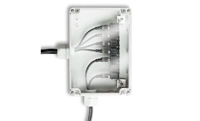 The smart sensor adapter case allows you to connect up to six smart sensors in a moisture-resistant enclosure to a single smart sensor extension cable back to a HOBO® station. The case is tested to NEMA 4X (IP65) Standards for protection from corrosion, wind-blown dust and rain, splashing water, and hose-directed water.