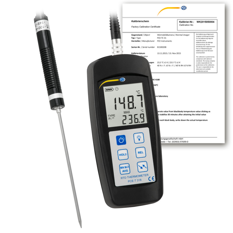 Accuracy (at 23°C / 73.4°F ± 5°C / 9°F): ± 0.1 % of reading + 0.4 °C / 0.72°F