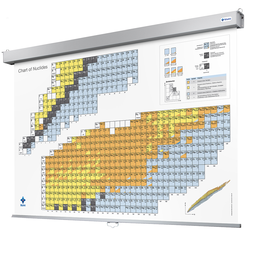 The blume chart of nuclides shows didactically optimized over 3,000 currently experimentally proven nuclides. The map provides over 10,000 highly precise data based on the well-respected National Nuclear Data Center of the Brookhaven Institute (USA). For teaching, studying and research in various departments, the great didactic value is in particular the readability optimized presentation of the data in interaction with the format adapted to the respective field of application.