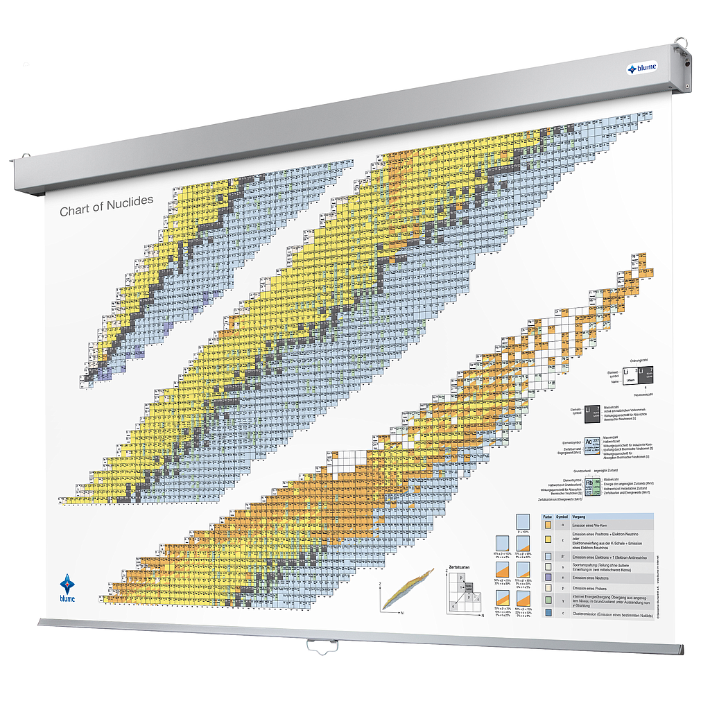 The blume chart of nuclides shows didactically optimized over 3,000 currently experimentally proven nuclides. The map provides over 10,000 highly precise data based on the well-respected National Nuclear Data Center of the Brookhaven Institute (USA). For teaching, studying and research in various departments, the great didactic value is in particular the readability optimized presentation of the data in interaction with the format adapted to the respective field of application.