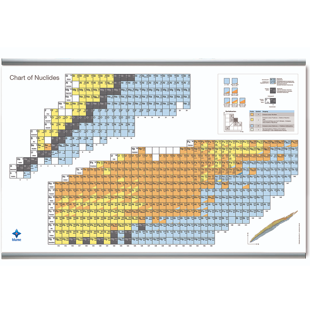 The blume chart of nuclides shows didactically optimized over 3,000 currently experimentally proven nuclides. The map provides over 10,000 highly precise data based on the well-respected National Nuclear Data Center of the Brookhaven Institute (USA). For teaching, studying and research in various departments, the great didactic value is in particular the readability optimized presentation of the data in interaction with the format adapted to the respective field of application.