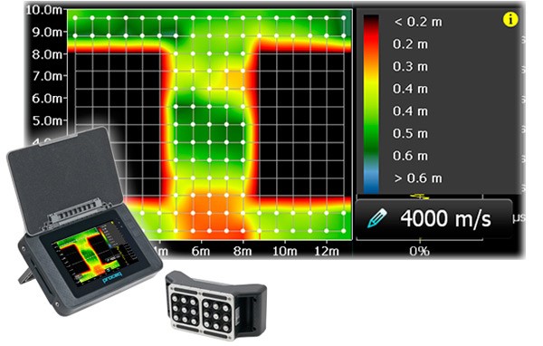 | Determination of crack depth | Detection and localization of voids, pipes, cracks (parallel to surface), and honeycombing |