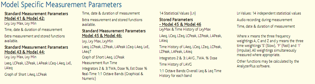 | Model 43 | Class 1 | SPL | A C Z (simultaneous measurement) frequency weighting F S & I (simultaneous measurement) Time weighting | Leq/Peak (inc C-A Quick Integrator Settings) Leq/Peak (inc C-A Quick Integrator Settings) | Pause & Back Erase Pause & Back Erase |