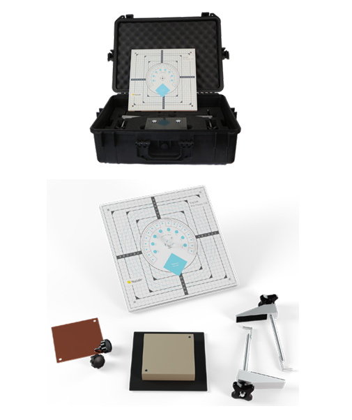 Made for acceptance and constancy tests of digital and analog radiography and fluoroscopy equipment. Suitable for routine quality checks on over-couch tubes, under-couch tubes and C-arms. Used for collimation/beam alignment, dynamic range, spatial and contrast resolution, homogeneity, and beam perpendicularity. Comes with holder for easy positioning on a table or chest wall. Complies with DIN 6868-150 and DIN 6868-4. Comes with a rugged case with space for a RaySafe X2 system.