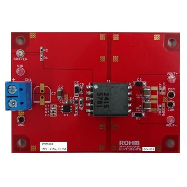 ROHM Semiconductor BD7F100HFN-EVK-003 ບົດປະຕິບັດການປົກຄອງແຮງໂຕລະວັດ - ບົດປະຕິບັດການປົກຄອງແຮງໂຕລະວັດປ່ຽນ BD7F100HFN-EVK-003 ສົ່ງອອກ 15 ໂວລຕ໌ ແລະ -15 ໂວລຕ໌ ຈາກອິນພຸດ 24 ໂວລຕ໌ ໂດຍໃຊ້ BD7F100HFN-LB, ວິທີການປ່ຽນກົດດັນ DC-DC ທີ່ແຍກຕ່າງ, ມີອິນທີເກດກຳລັງອອກສູງສຸດ 0.165A.