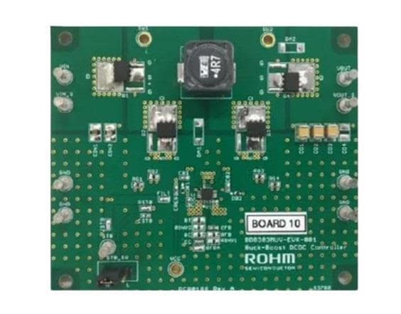 ROHM Semiconductor BD8303MUV-EVK-001 ຕົວແປກະຕຸ້ນ AC/DC ອອກ 12V ຈາກແຮງແສງເຂົ້າ 4V ຫາ 14V ຂອງຊ່ວງແຮງແສງເຂົ້າ 2.7V ຫາ 14V. ອອກ 1.8V ຫາ 12V ດ້ວຍຕົວຕ້ານພາຍນອກ.