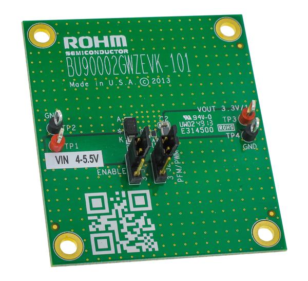 ROHM Semiconductor BU90002GWZ-E2-EVK-101 ບົດທົດສອບຕົວຄວບຄຸມແຮງດັນສະຫວ່າງ - ຕົວຄວບຄຸມສະຫວ່າງປ່ຽນແປງສໍາລັບ BU90002GWZ ແມ່ນຕົວຄວບຄຸມລົດລົງທີ່ສາມາດສົ່ງອອກ 3.3V,1A ຈາກແຫຼ່ງພະລັງງານ 4.0V ຫາ 5.5V.