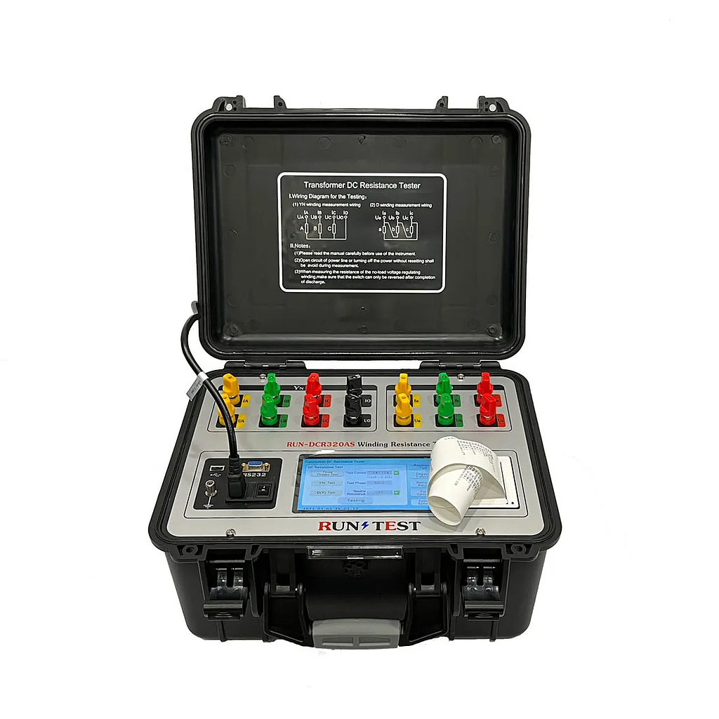 It can be used to effectively detect the defects in poor material selection, loose welding and connection parts, missing strands and broken wires of the transformer coil, as well as the operation hidden dangers. In order to meet the requirements of rapid measurement of transformer DC resistance, a RUN-DCR320AS Winding Resistance Tester with Three-Phase simultaneous test function, Magnetic Augment Function, and Degauss Function into one body has been developed in our company. The tester has the functions of three-phase simultaneous power-on, independent current and voltage sampling, simultaneous measurement and display of three-phase resistance and three-phase unbalance rate, so as to greatly shorten the test period of transformer DC resistance and solve the problems about long time consumption for DC resistance measurement of each tap winding in power transformers.