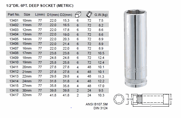 SATA 13408 1/2 ນິ້ວ DR. 6PT. ເລິກຊັອກເກັດ (Metric) | EMIN.COM.LA