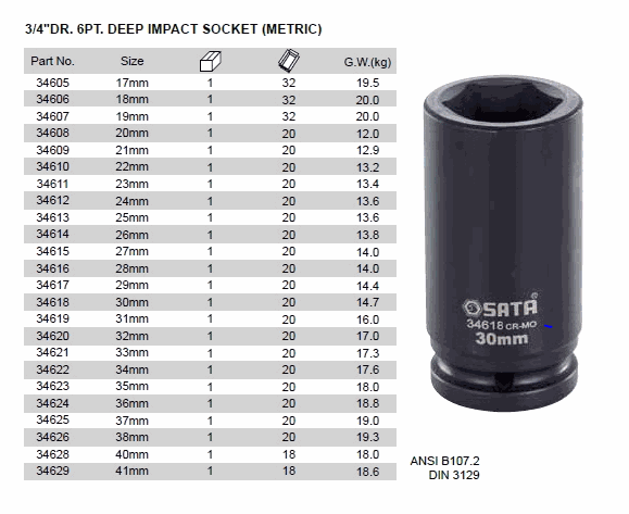 SATA 34618 ເຕົ້າຮັບຜົນກະທົບເລິກ 3/4 ນິ້ວ (30mm) | EMIN.COM.LA