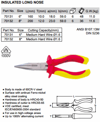 SATA 70131 Insulated Long Nose Piler (6 inch, ø1.6mm, 1000V) | EMIN.COM.LA
