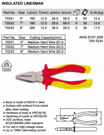 SATA 70332 PLIER LINESMAN insulated 7 ນິ້ວ (180mm, ø2.0mm, 1000V) | EMIN.COM.LA