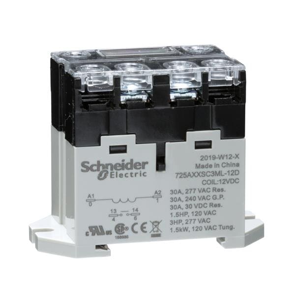 Schneider Electric Relays 725AXXSC3ML-12D ຣີເລຍພວງງານມາດຕະຖານ SPST-NO 30 A, ຕົວຕໍ່ສູດດວງສອງ | EMIN.COM.LA