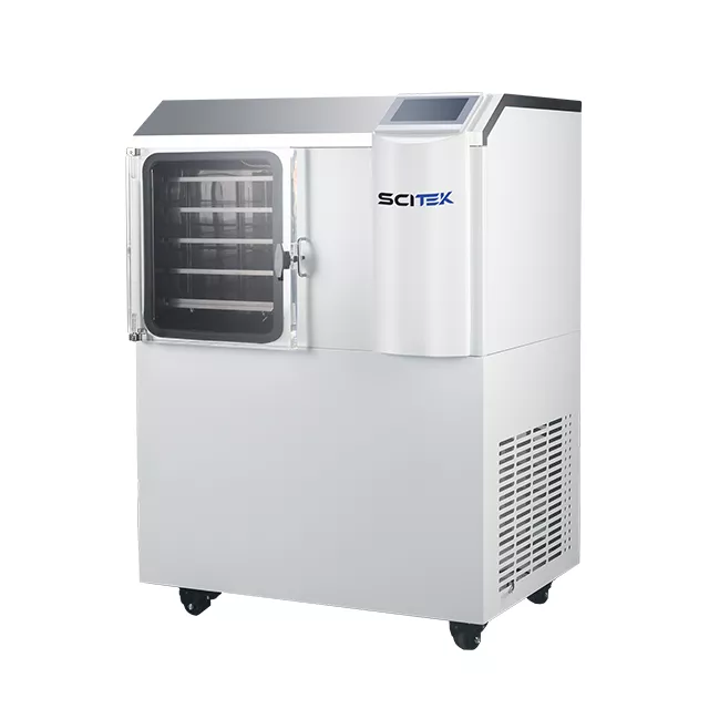 "FD-PS series can be used for both liquid and solid samples, and all operations can be carried out inside the chamber. Based on the set temperature, time, and vacuum pressure, the sample can be pre-frozen in situ, with temperature probes on each shelf. The transparent organic glass cold trap door allows observation of the ice formation inside the cold trap. Quick hot gas defrosting can be selected, with shelf temperatures ranging from 50°C to +60°C. The effective shelf area ranges from 0.1 to 0.48m2.