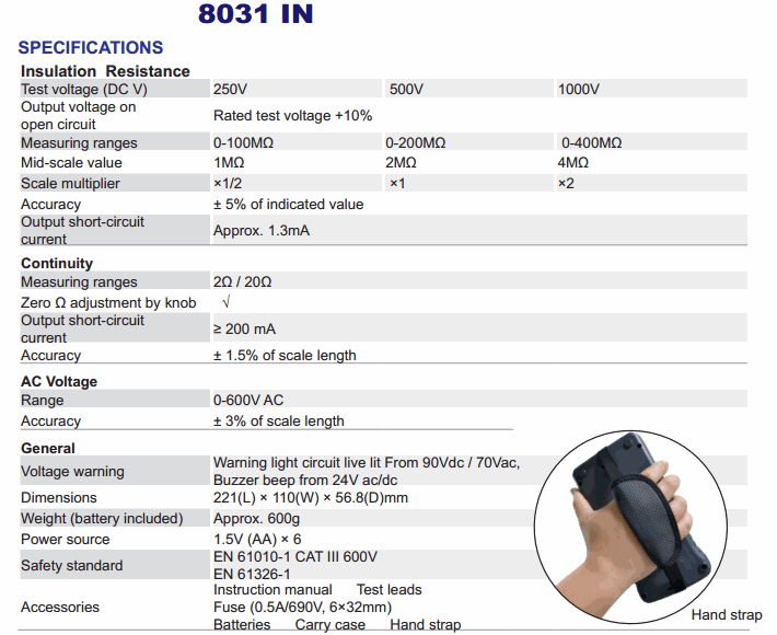 ● Three insulation test voltages(DC) : 250V, 500V, 1000V.