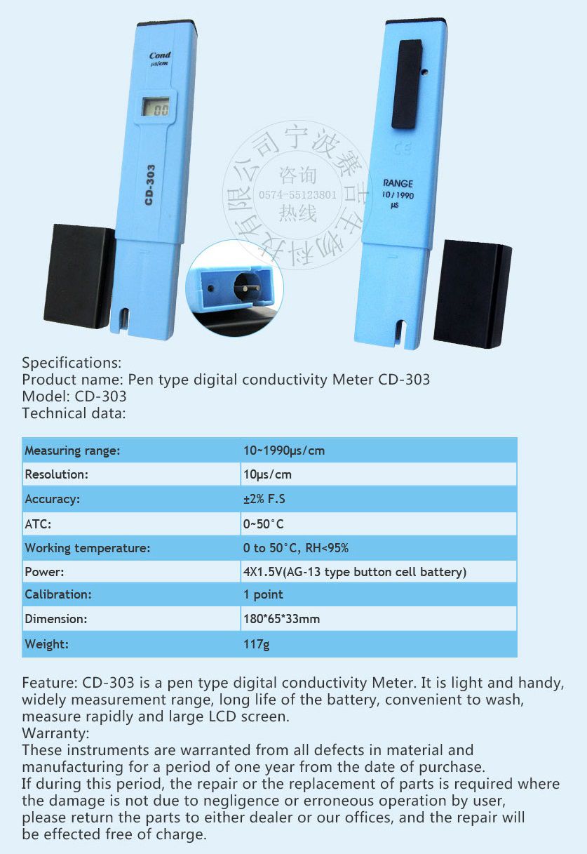 Sinotester CD-303 ເຄື່ອງວັດແທກຄວາມທົນທານຕໍ່ປະເພດປາກກາ (10~1990μs/cm) | EMIN.COM.LA