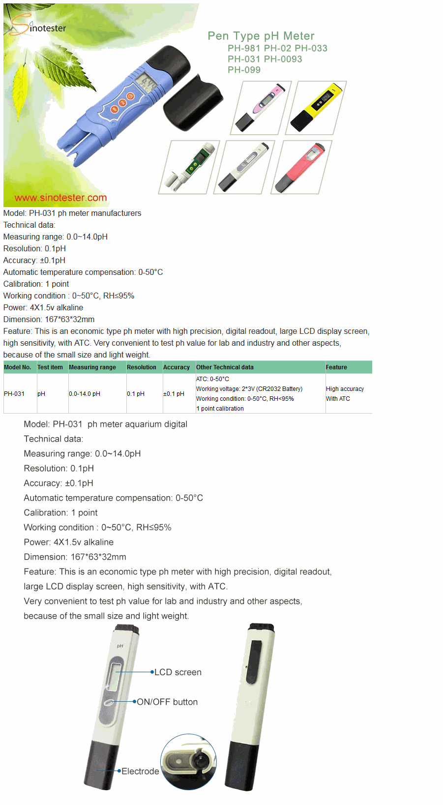 Sinotester PH-031 ເຄື່ອງວັດ pH ປະເພດປາກກາ (0.0~14.0pH, ±0.1pH) | EMIN.COM.LA