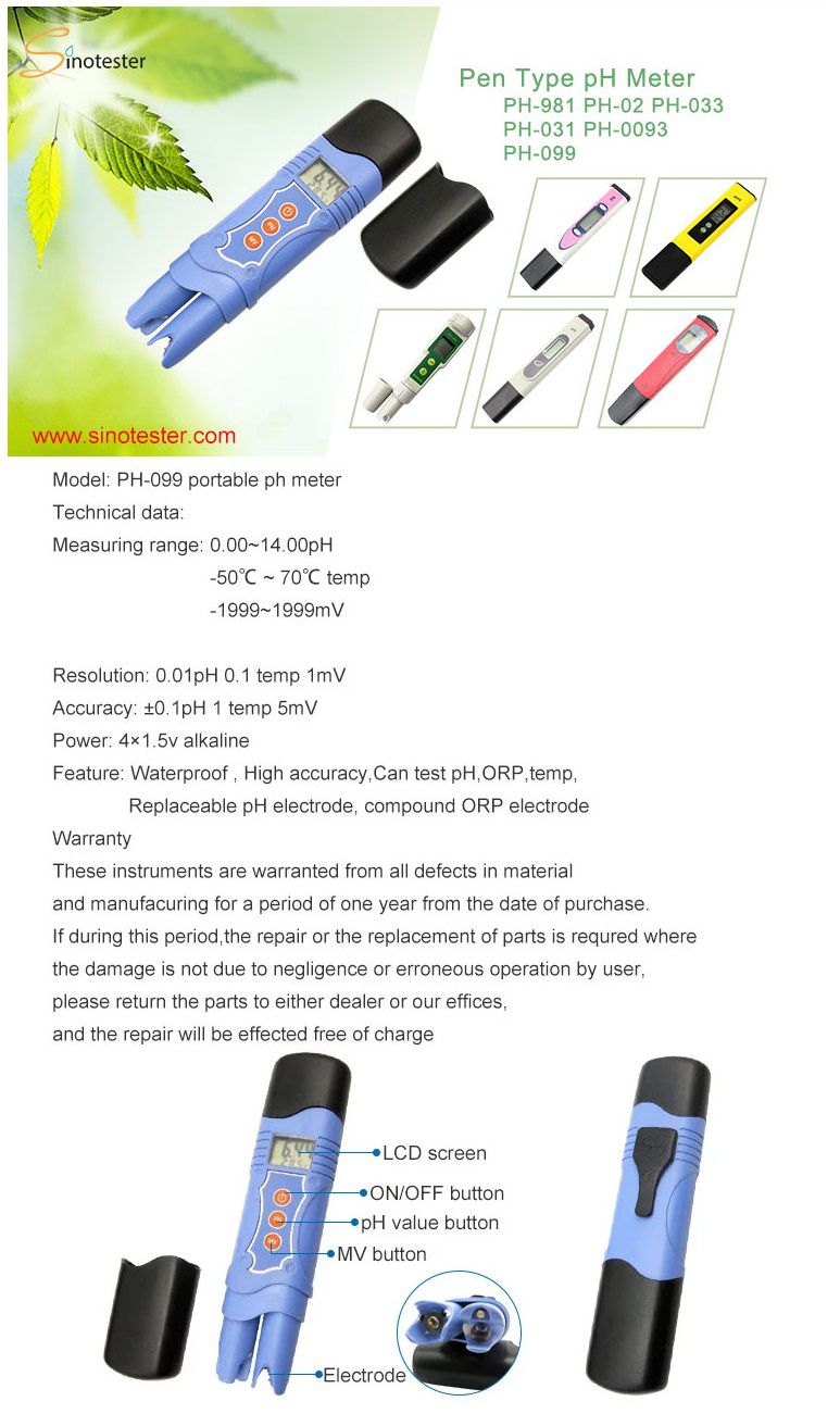 Sinotester PH-099 ເຄື່ອງວັດ pH ປະເພດປາກກາ (0.0~14.0 pH) | EMIN.COM.LA