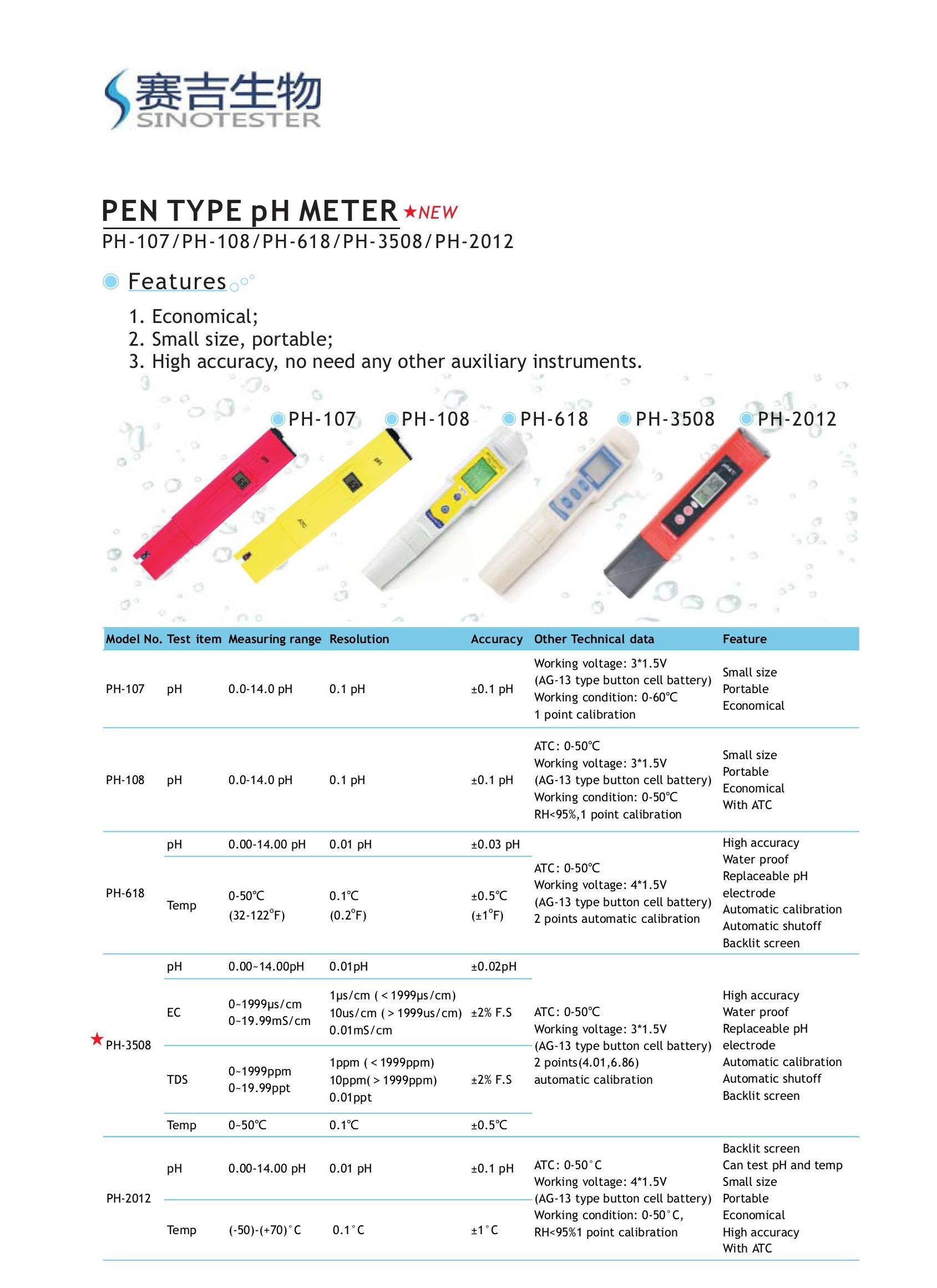 Sinotester PH-108 ເຄື່ອງວັດແທກ pH ປະເພດປາກກາ (0.0~14.0pH, ±0.1pH) | EMIN.COM.LA