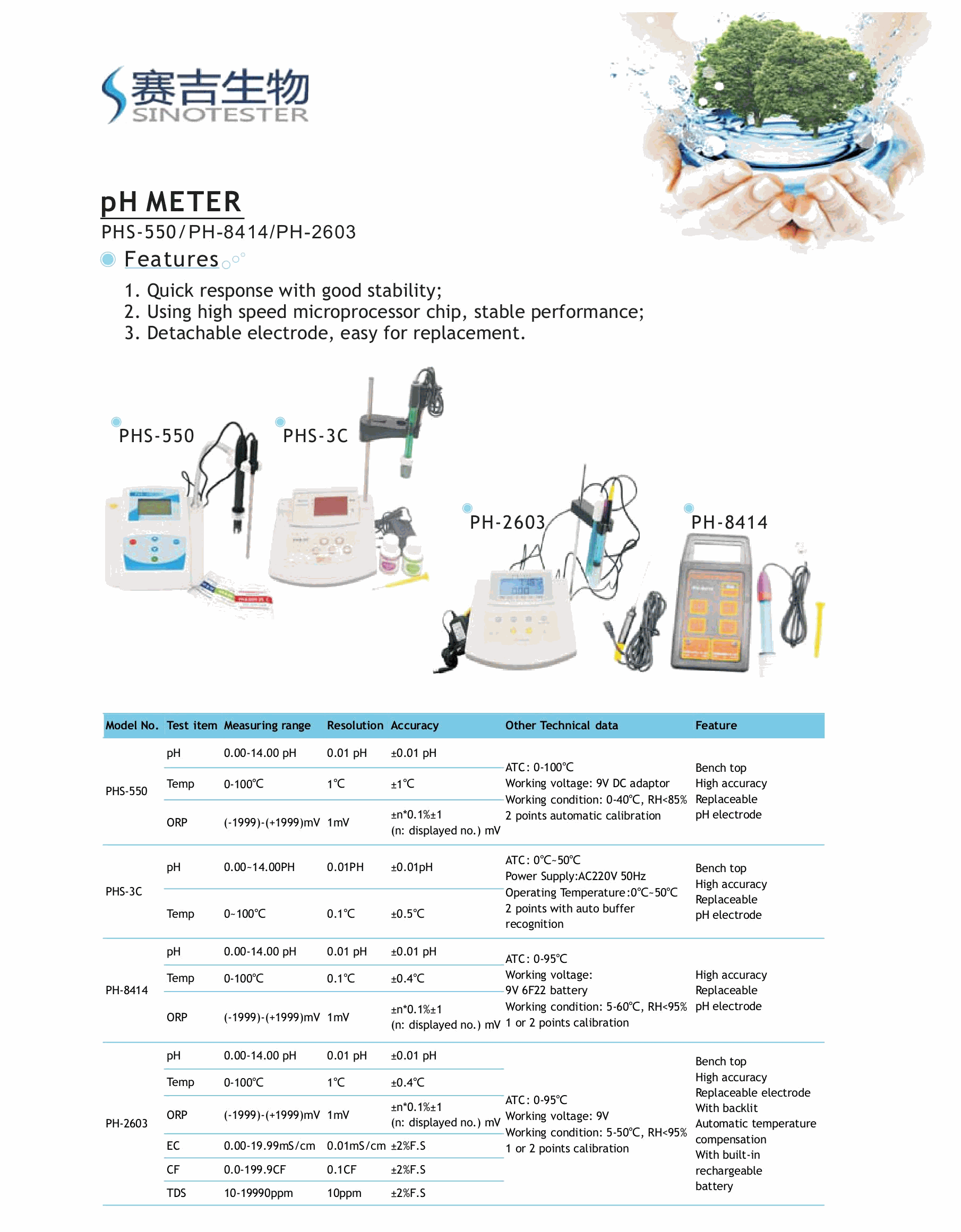 Sinotester PH-2603 ເຄື່ອງວັດແທກ pH ເທິງເກົ້າອີ້ (0.00~14.00pH, ±0.01pH) | EMIN.COM.LA